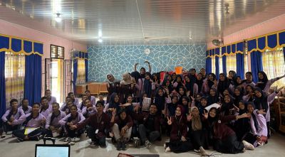 Para siswa SMA Dwiwarna (Boarding School) dengan latar belakang sekolah tercinta